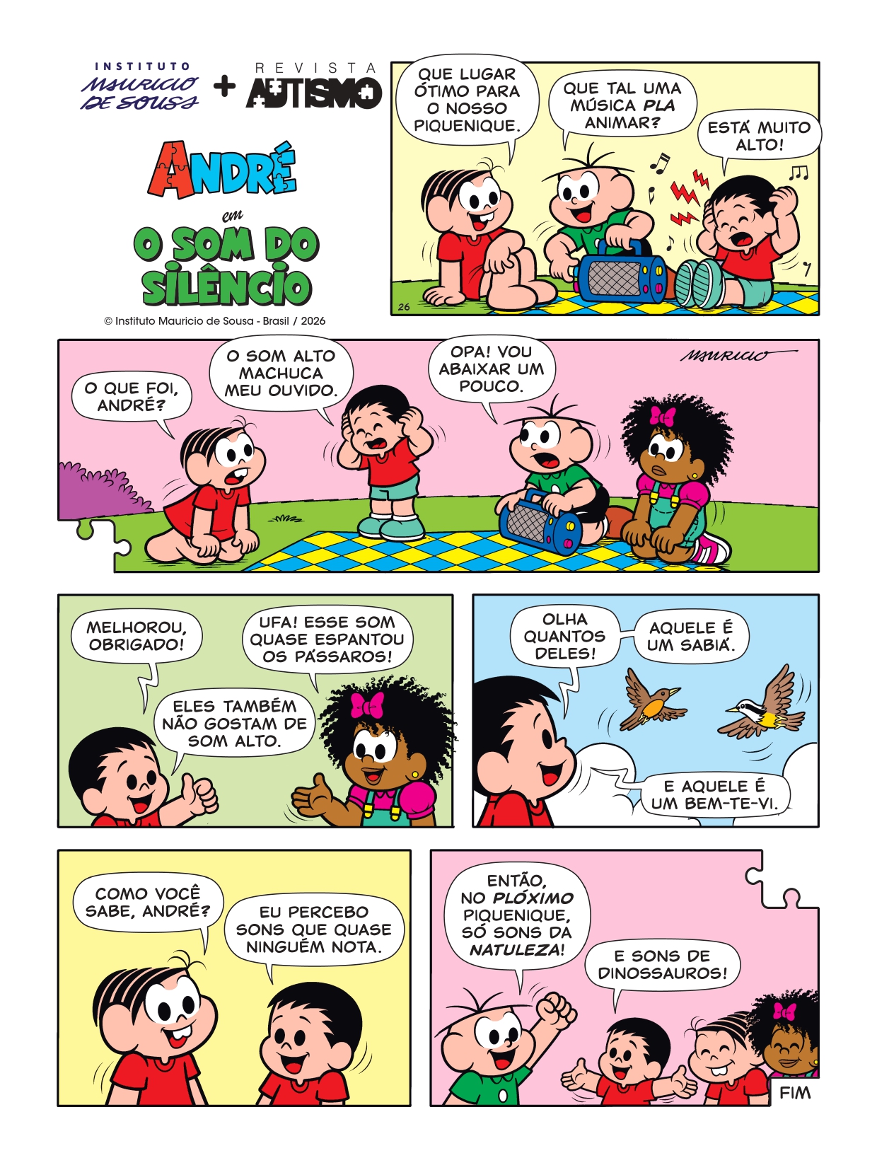 Em mais uma história em quadrinhos (HQ) exclusiva do André e a Turma da Mônica, desta vez na edição (nº 32) da Revista Autismo, do trimestre março/abril/maio.2026, intitulada “O som do silêncio”, o personagem autista de Mauricio de Sousa lida com ambientes barulhentos entre amigos.