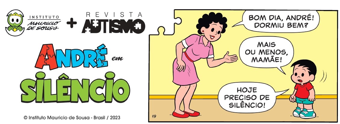 Em mais uma história em quadrinhos (HQ) exclusiva do André e a Turma da Mônica, desta vez na edição (nº 23) da Revista Autismo, do trimestre dezembro/2023/janeiro/fevereiro.2024, intitulada “Silêncio”, o personagem autista de Mauricio de Sousa precisa encontrar um lugar tranquilo depois de uma noite mal dormida.
